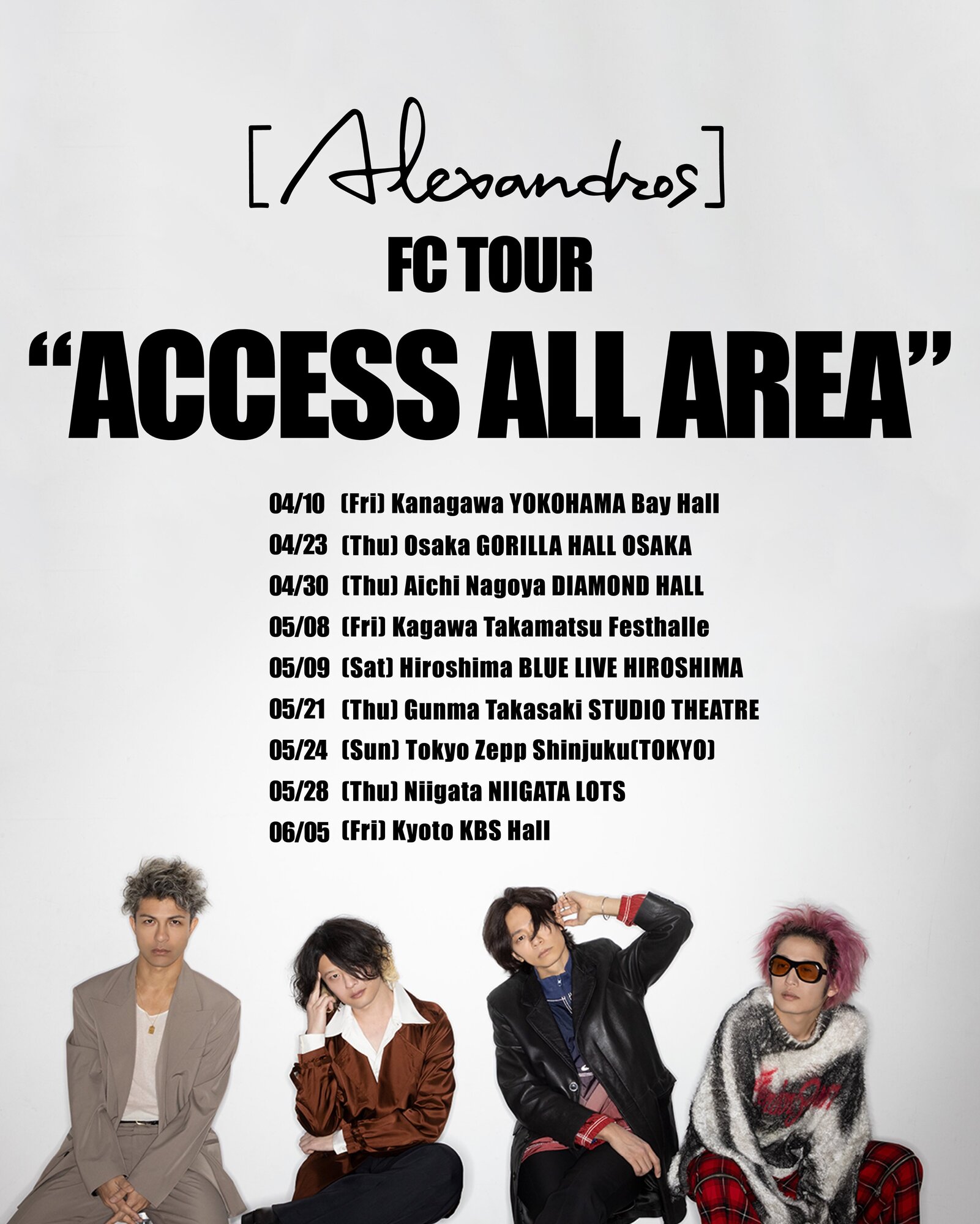 2026.4.10(金)神奈川 横浜ベイホールを皮切りに全国9カ所で[Alexandros]CREWと[Alexandros]MOBILE会員を対象に開催されるFC TOUR "ACCESS ALL AREA"の公式チケットトレードが決定しました。